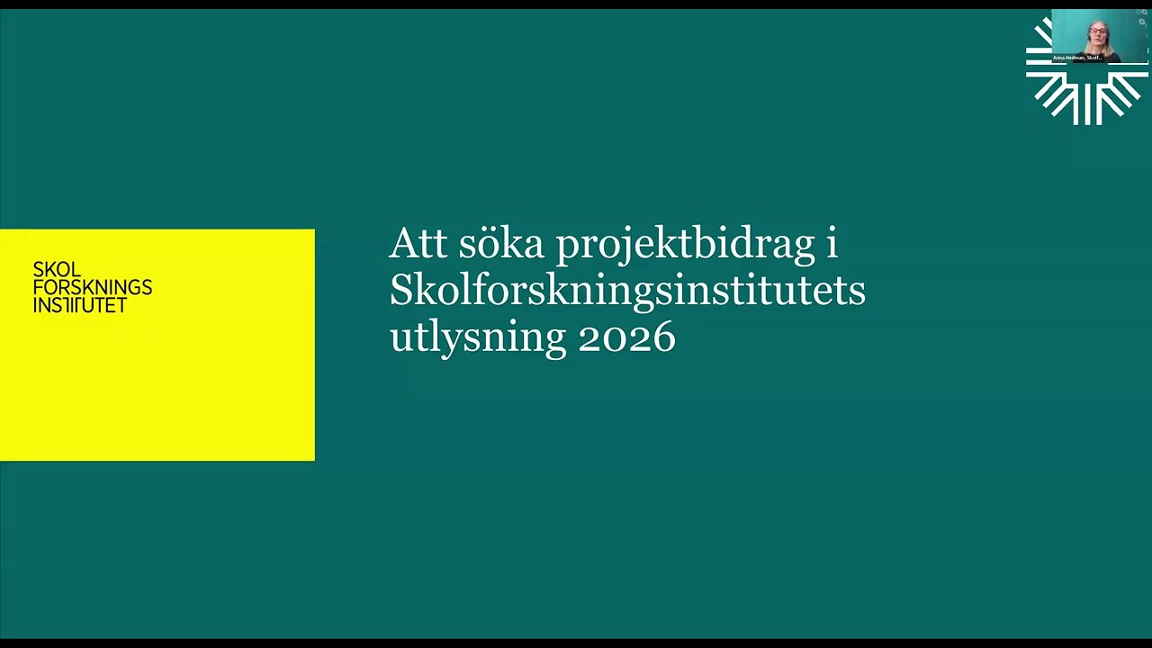 Skolforskningsinstitutets forskningssekreterare, Maria Bergman, ger en introduktion till institutets forskningsprofil, råd om hur man ska fylla i ansökan och presenterar nyheter i årets utlysning av forskningsbidrag.