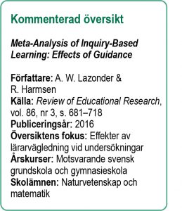 Forskningsöversikten bidrar med kunskap om vilka effekter olika typer av vägledning från läraren har på elevernas utveckling och lärande när de arbetar med undersökningar i naturvetenskap och matematik. Översikten belyser vad lärares vägledning betyder för vad eleverna gör när de undersöker, vad de konkret lyckas åstadkomma och vilka kunskaper de utvecklar vad gäller både traditionellt ämnesinnehåll och förmågan att genomföra undersökningar.